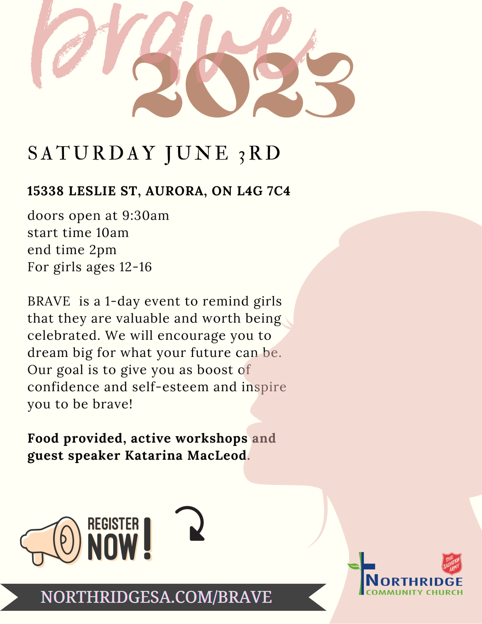 Details: The Salvation Army, at our location at Northridge Community Church, will be hosting a BRAVE event where we expect upwards to 60 girls aged 12 – 16 plus volunteers to attend.