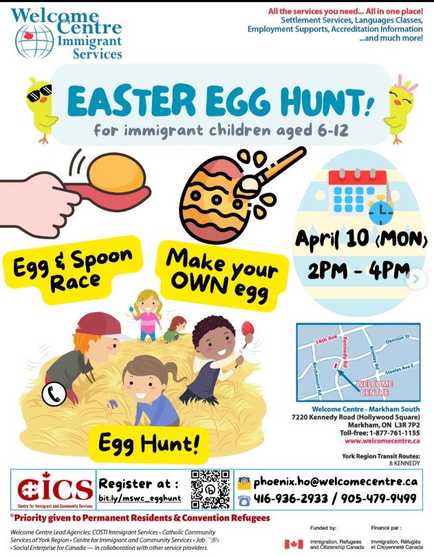Join Welcome Centre Immigrant Services at Welcome Centre Markham South on April 10th 2023 from 2-4pm for an egg and spoon race, make your own Easter eggs and egg hunt! for ages 6-12.