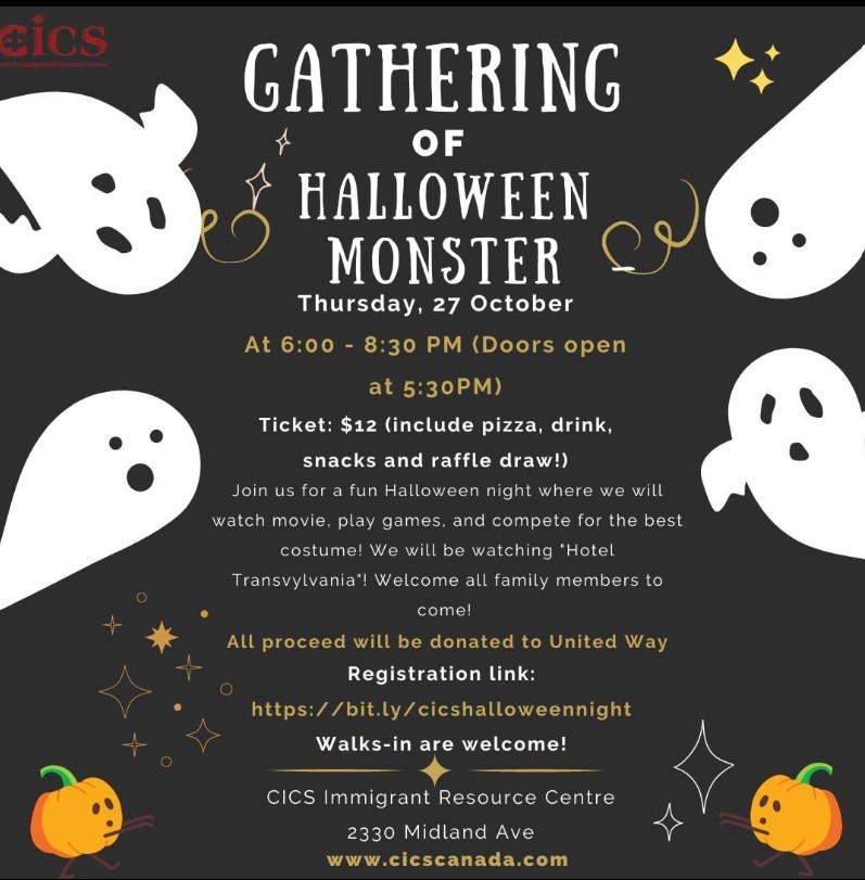 Hello Youth! This Halloween, we will be having a Halloween Family fun night in our Immigrant Resources Centre location! We will play trivia games, watch movie and compete for the spoookiest costume of the night! Come join us and families are welcome to join!