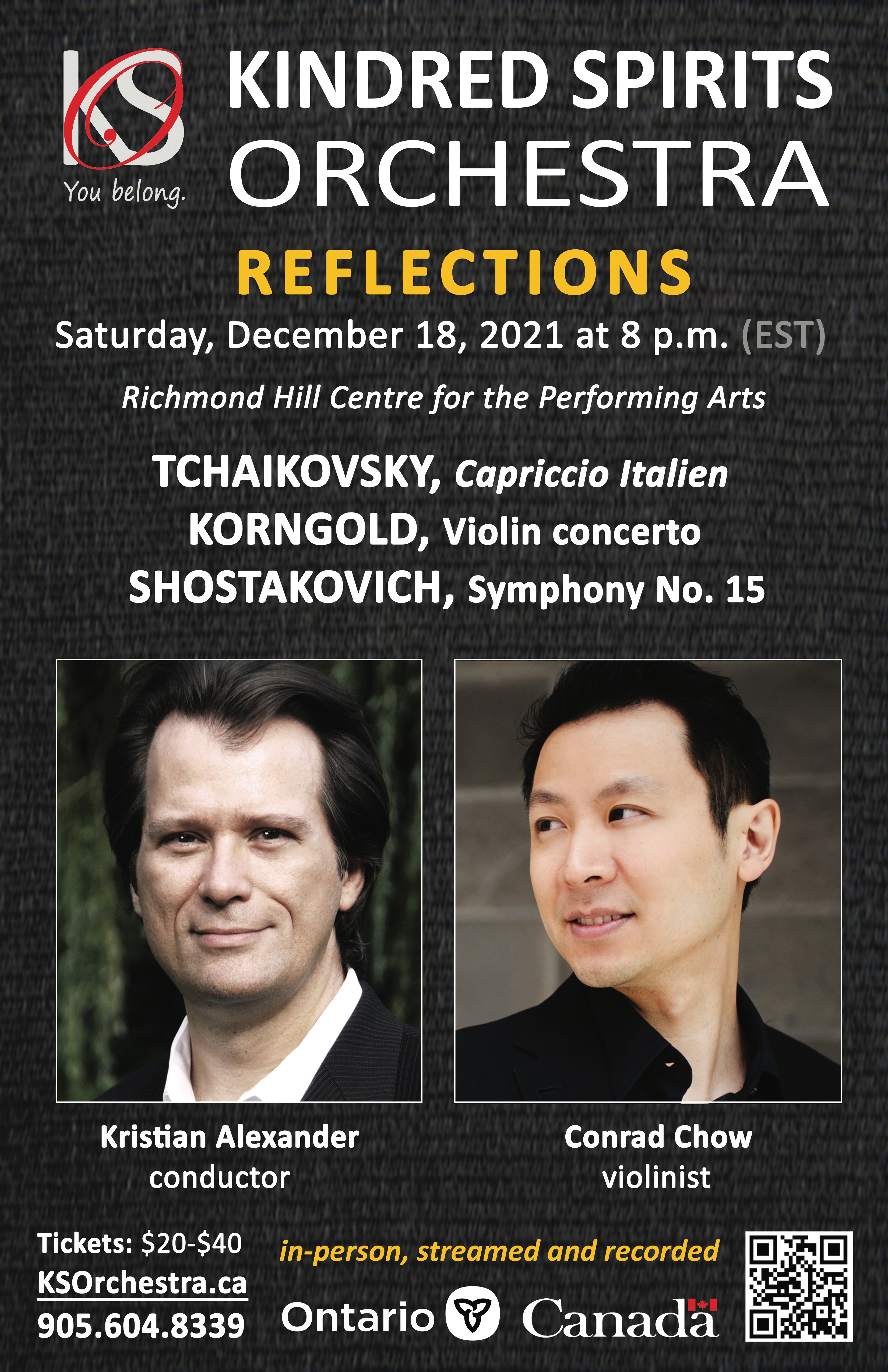 Under the direction of Maestro Kristian Alexander, the Kindred Spirits Orchestra performs a night of exceptional and evocative music. Tchaikovsky’s poignant Capriccio Italien is a musical travelogue painting the landscape of the composer’s journey to Rome. Internationally acclaimed violinist Conrad Chow commands the stage with Korngold’s romantic film-score inspired Violin Concerto. From seemingly inconsequential playful musical quotes to deeply profound phrases, Shostakovich’s ultimate Symphony No. 15 embodies a range of musical emotion analogous to the composer and his life.