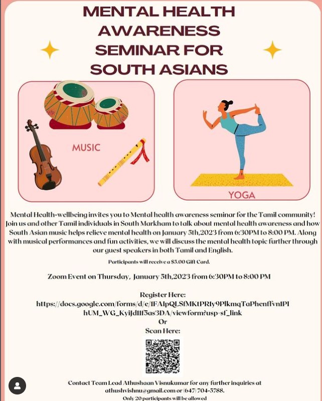 The South Markham Well-being group invites you to their Mental Health Awareness Seminar for South Asians! Join us on Zoom for an evening of different mental health relieving activities, such as musical performances, yoga, fun games, and a conversation with a guest speaker on Mental Health and Mental Wellness. This virtual event will be presented in both Tamil and English.