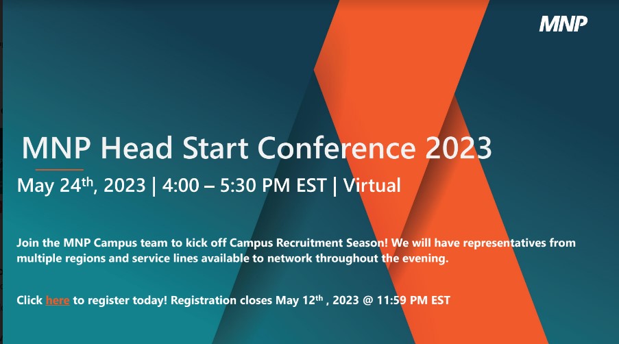 Important: Please email a copy of your updated Resume & Unofficial Transcript as a PDF in one document to HeadStart@mnp.ca with the subject line : (Head Start 2023, city you are interested in). We have over 100+ office locations across Canada!
