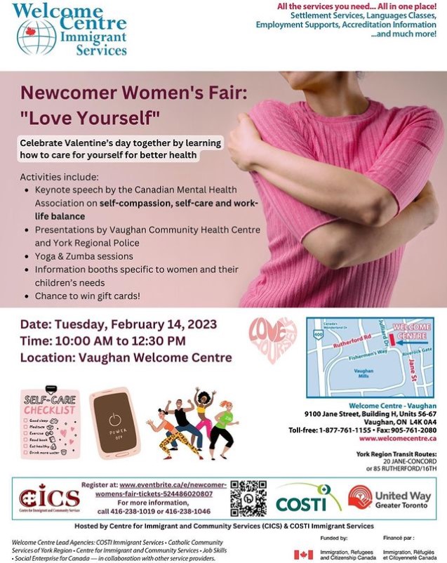 Welcome Centre Immigrant Services presents: 📣Newcomer Women’s Fair: “Love Yourself” is coming up soon at Vaghuan Welcome Centre on Valentine’s Day!💖 Join us to learn more about self-compassion, self-care and work-life balance, there will also be Yoga & Zumba sessions!