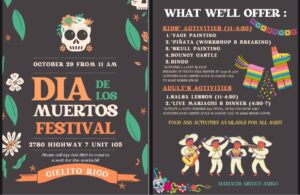 Come to celebrate DDLF (Day of the Dead a Mexican Holiday) with us with Mariachi, pan de Muerto, piƱatas, face painting, bouncy castle, bingo and more! Certain activities and dinner are paid* Please see flyer for details. Activities have limited space so please call to make a reservation! We are located at 2780 Highway 7, …
