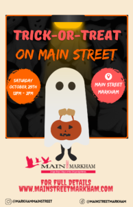 Trick or Treat on Main Street Markham!!! Join us Saturday, October 29th from 12pm-2pm! Get your costumes ready to trick-or-treat at the businesses along Main Street Markham Take photos with your favourite Characters & tag us in your photos. Prizes will be given for best costumes (announced October 31st!) Facebook: @mainstreetmarkham Instagram: @markhammainstreet We are …