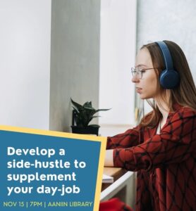 Location: Aaniin Library (5665 14th Ave, Markham, ON L3S 3K5) Date: Tuesday November 15, 2022 Time: 7pm Do you have dreams to become your own boss one day? Or do you wish your passion projects could generate some side-income? Learn about the foundational activities required to shape your ideas into a viable side-business. Consolidate your …