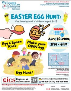 Join Welcome Centre Immigrant Services at Welcome Centre Markham South on April 10th 2023 from 2-4pm for an egg and spoon race, make your own Easter eggs and egg hunt! for ages 6-12. Please call or email to register at: phoenix.ho@welcomecentre.ca 416-936-2933 / 905-479-9499