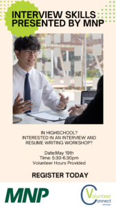 MNP Interview Skills Presentation for HighSchool Students Date: Friday May 15th, 2023 Time: 5:30pm-6:30pm Location: Virtual Microsoft Teams Meet Registration: Registration required: MNP-https://docs.google.com/forms/d/16Hd8NMSA-iIXrwWetXFPmIh49sBp6avshs4Q6kCOYww/edit Other info: Volunteer hours will be granted to York Region High School students by VCYR Program Manager post presentation attendance and/or participation. 1 hour for attendance 2 hours for attendance & participation.
